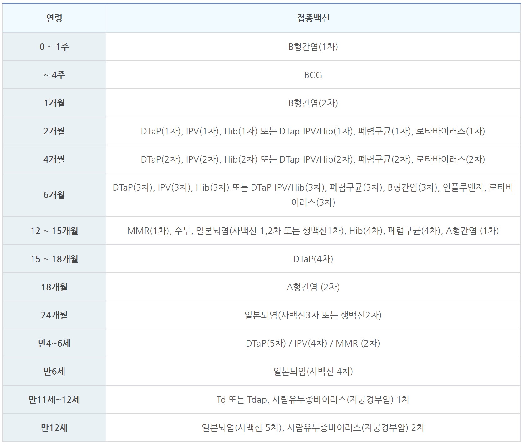 ** 만 11세 ~ 12세가 되면 6차 Tdap 접종