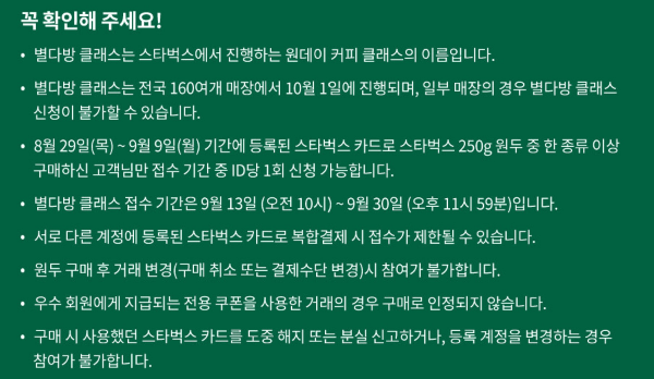8월 29일부터 9월 9일까지 스타벅스 원두를 구매하면 "별다방 클래스"에 참여할 수 있다고 합니다.